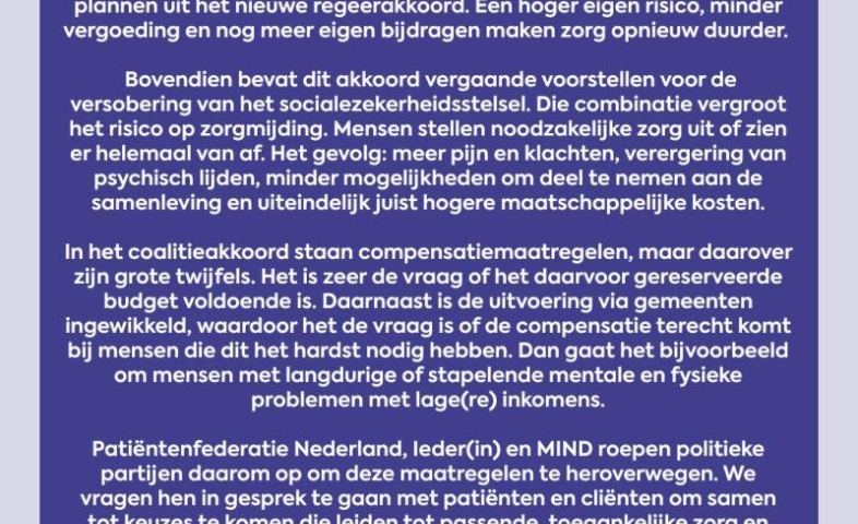 Wij zetten ons in voor alle mensen die zorg nodig hebben, nu of in de toekomst. Patiëntenfederatie Nederland vertegenwoordigt ruim 200 patiëntenorganisaties en geeft patiënten een stem: in de spreekkamer, in de politiek, bij de zorgverzekeraar en in het nieuws. Zo willen wij: wachtlijsten verkorten, meer inzicht in kwaliteit van zorg, medicijntekorten aanpakken, gegevensuitwisseling verbeteren en de stapeling van zorgkosten verminderen.