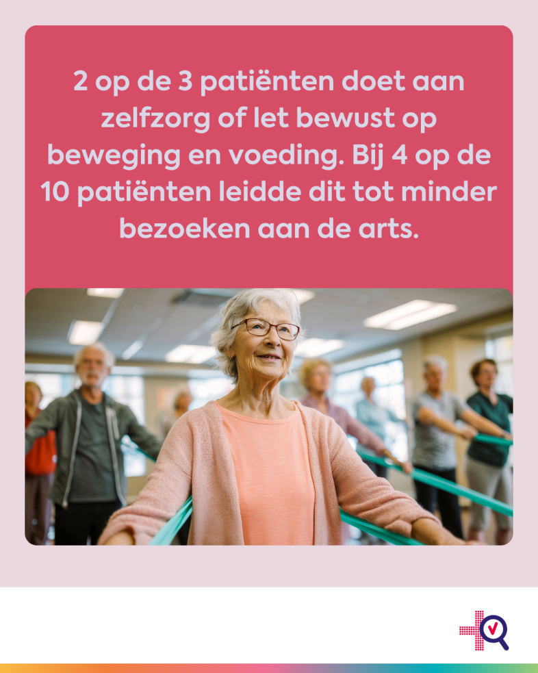 Twee derde van de deelnemers aan het onderzoek doet aan zelfzorg met zelfzorgmiddelen, of is bewust bezig met bewegen en/of voeding. Bij vier op de tien leidde dit ertoe dat een bezoek aan de zorgprofessional niet meer nodig was.