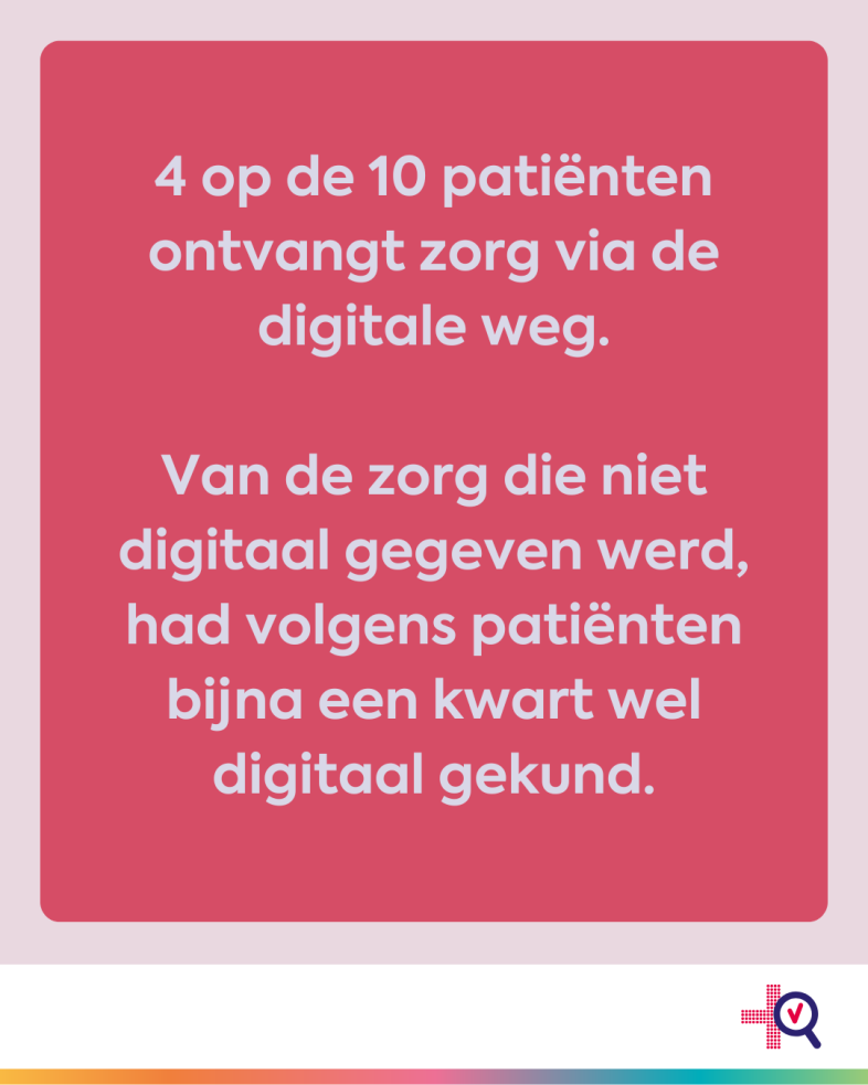 Bijna vier op de tien deelnemers heeft de afgelopen twee jaar zorg via de digitale weg ontvangen. Van de zorg die niet digitaal gegeven werd, had volgens de deelnemers bijna een kwart wel digitaal gekund. Driekwart van de deelnemers volgens wie de zorg ook online had gekund, had dit ook (gedeeltelijk) gewild.