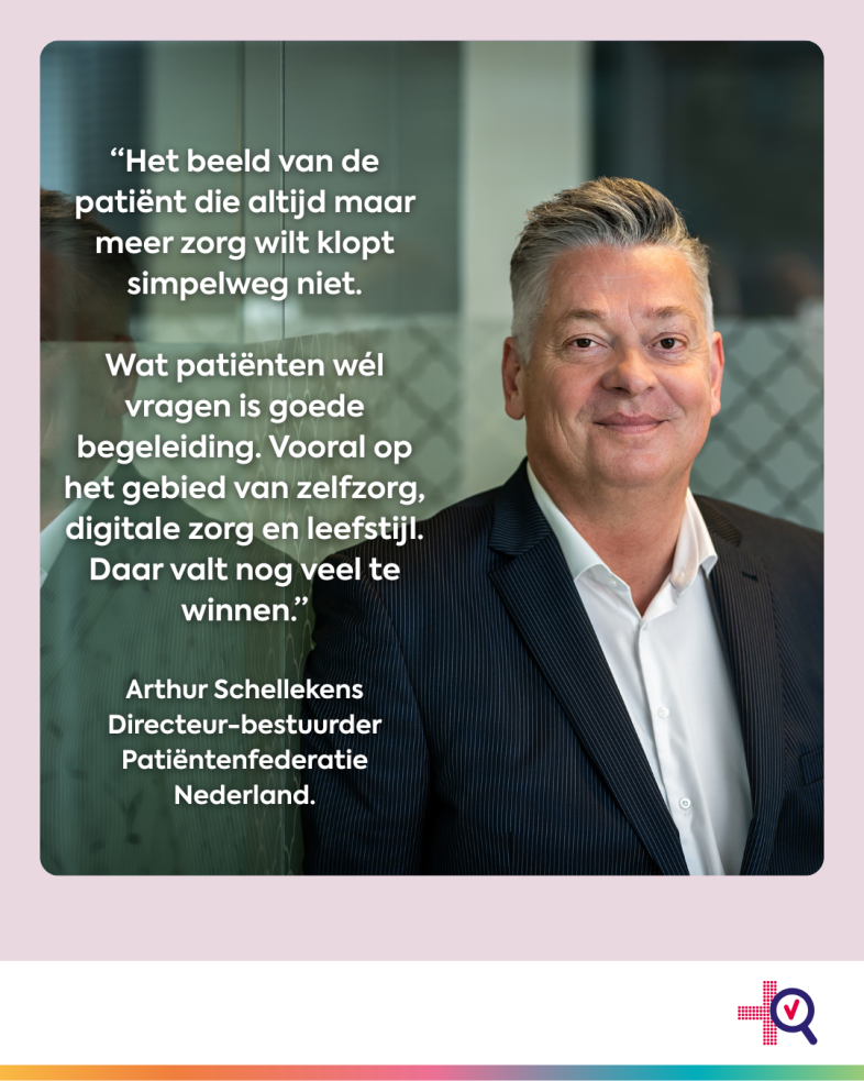“Patiënten doen er alles aan om de zorg in de toekomst toegankelijk te houden,” aldus Schellekens. “Ze passen hun leefstijl aan, meten thuis hun waarden, zoeken zelf informatie op en zorgen voor hun naasten. Dat doen ze niet omdat ze méér zorg eisen, maar juist omdat ze de zorg zo min mogelijk willen belasten. Het beeld van de patiënt die altijd maar meer zorg wilt, klopt simpelweg niet. Wat patiënten wél vragen, is goede begeleiding, vooral op het gebied van zelfzorg, digitale zorg en leefstijl. Dit moet verbeteren om de zorg ook in de toekomst toegankelijk en betaalbaar te houden.”
