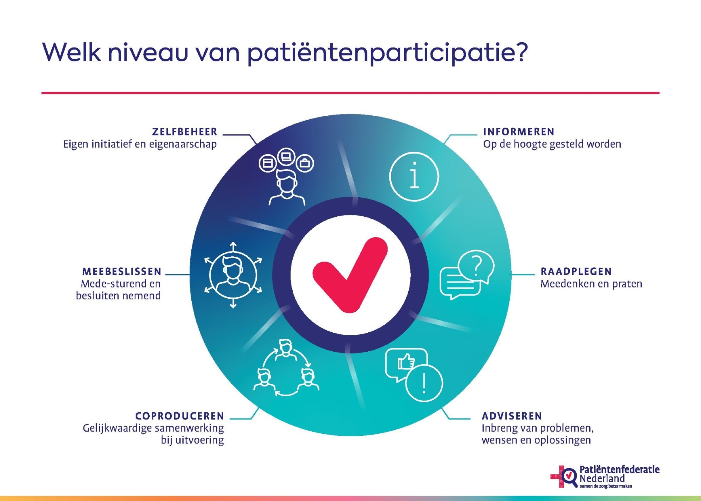 Dit is bedoeld voor partijen die op zoek zijn naar de inbreng van patiënten(vertegenwoordigers) op verschillende niveaus.